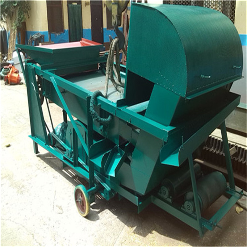 本機為三層篩網(wǎng),先經(jīng)過進料口處風(fēng)機抽風(fēng),直接抽走重量輕的雜葉或麥秸稈,上層篩的初次篩分再把大雜清理過,好的糧食(種子)直接落到下層篩網(wǎng)上,下層篩網(wǎng)會把糧食(種子)中的小雜.小石子.有缺陷的糧食(種子)直接漏掉,完好的糧食(種子)會從出料口篩分出來。該小型清糧機解決了揚場機的功能單一,不能有效去除石子.土塊的缺陷,更能為清理、凈選糧食(種子)帶來滿意的效果。該機有占地小,移動方便,便以維修,除塵除雜效率明顯,能耗低,使用簡便等優(yōu)點。