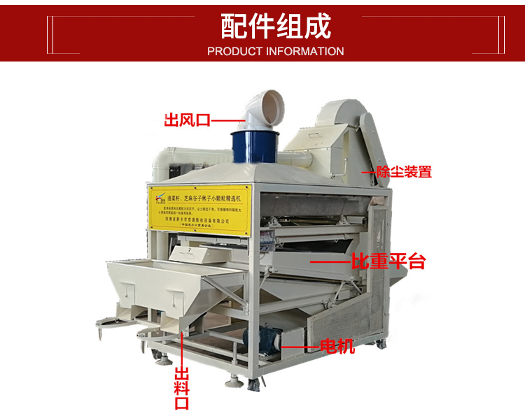該機(jī)按物料大小、重量或外形輪廓的差異進(jìn)行風(fēng)選和比重篩選相結(jié)合的谷物清選設(shè)備。該機(jī)采用正壓的方式,利用氣流和振動(dòng)摩擦對物料產(chǎn)生的綜合作用,比重較大的物料沉降到底層,通過篩面的振動(dòng)摩擦向高處移動(dòng),比重較小的物料經(jīng)氣流作用則懸浮在料層的表面向低處流動(dòng),以達(dá)到按比重分離的目的。該機(jī)能有效剔除物料中的雜質(zhì)【霉?fàn)€變質(zhì)粒、蟲蛀粒、黑粉病粒、秕谷粒、芽谷粒、大重雜、小重雜、粉塵等】。該機(jī)廣泛用于玉米、小麥、水稻、決明子、大豆、蔬菜等農(nóng)作物種子和形態(tài)的草籽,如牧草種、園藝種、林木種等種子的清選加工。