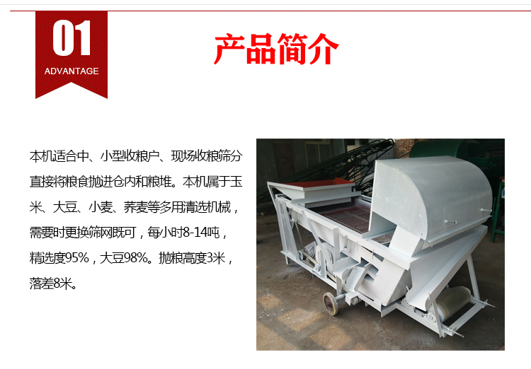 本機(jī)適合中、小型收糧戶、現(xiàn)場收糧篩分直接將糧食拋進(jìn)倉內(nèi)和糧堆。本機(jī)屬于玉米、大豆、小麥、蕎麥等多用清選機(jī)械,需用時更換篩網(wǎng)即可,每小時8噸,精選度95%,大豆98%。拋糧高度2.5米,落差4-6米。