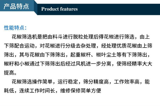 隴南花椒清選分離篩分機(jī)廠家 花椒清選篩也稱為花椒篩選機(jī)、花椒篩分機(jī)等,其功能就是把烘干后的花椒粉碎、脫粒、篩選,把花椒的枝葉、殼、籽等分別篩選出來,花椒殼屬于成品作為調(diào)味品售賣,走進(jìn)我們千家萬戶,椒籽則用來榨油,各有各的用途,花椒也是入藥的藥材,一顆小小的花椒發(fā)揮出了很大的自身價(jià)值。 花椒破碎分級(jí)篩